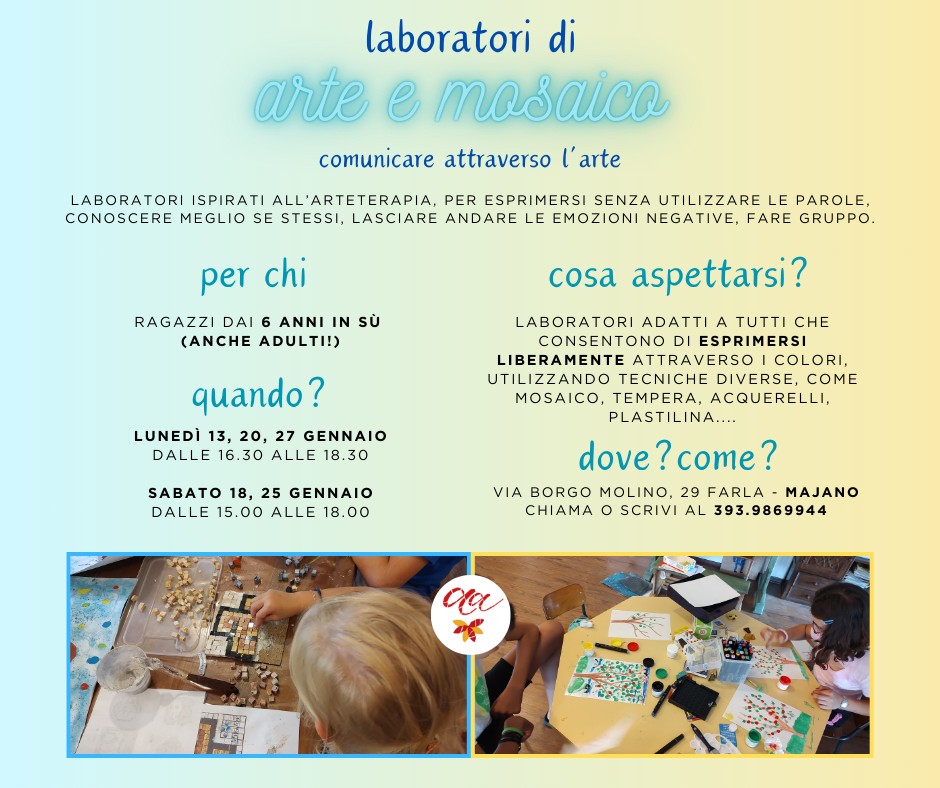 COSA ASPETTARVI: Laboratori ispirate all’arteterapia in cui i partecipanti sono liberi di esprimersi attraverso varie tecniche artistiche, fra cui il mosaico. L’utilizzo di materiali diversi aiuta ad esprimersi e far uscire le emozioni negative, a divertirsi aumentando l’autostima e a fare gruppo alimentando il rispetto per gli altri.
