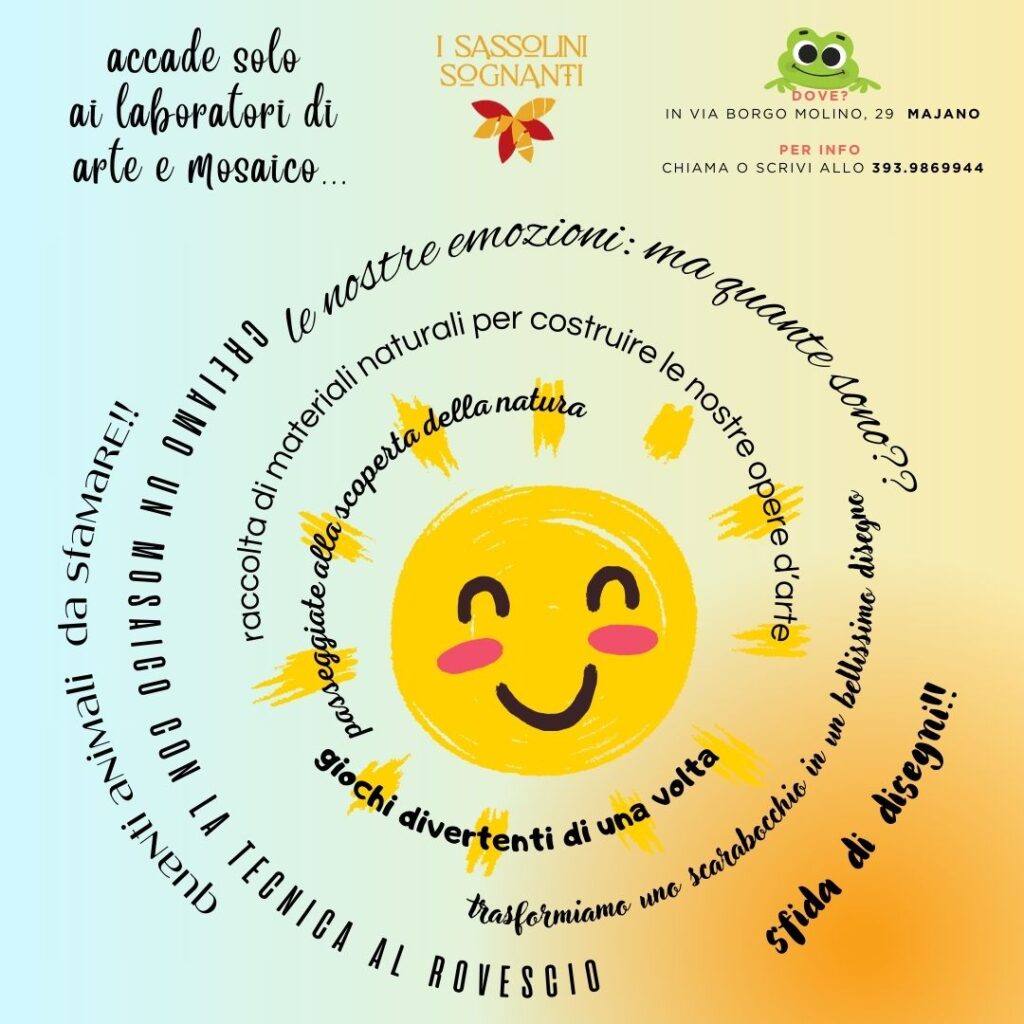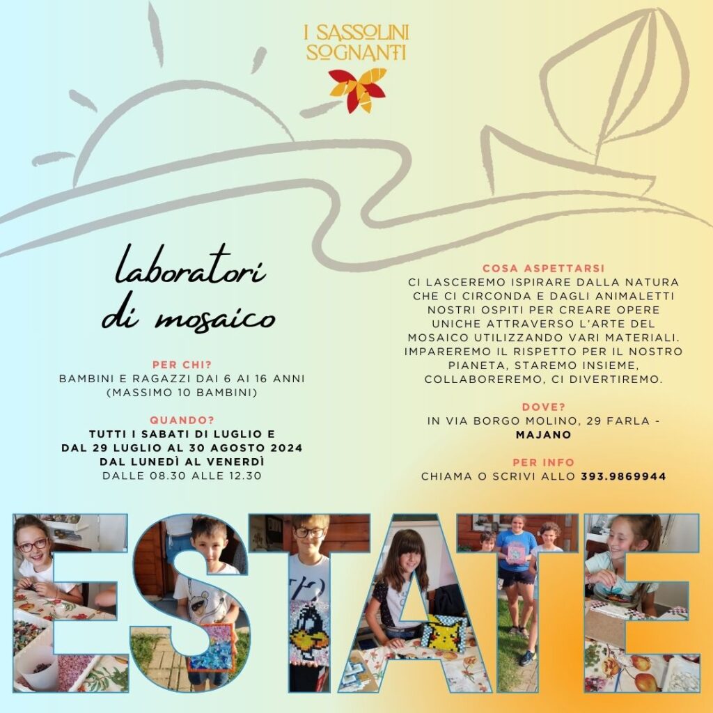 COSA ASPETTARVI: Ci lasceremo ispirare dalla natura che ci circonda e dagli animaletti nostri ospiti per creare opere uniche attraverso l’arte del mosaico utilizzando vari materiali.