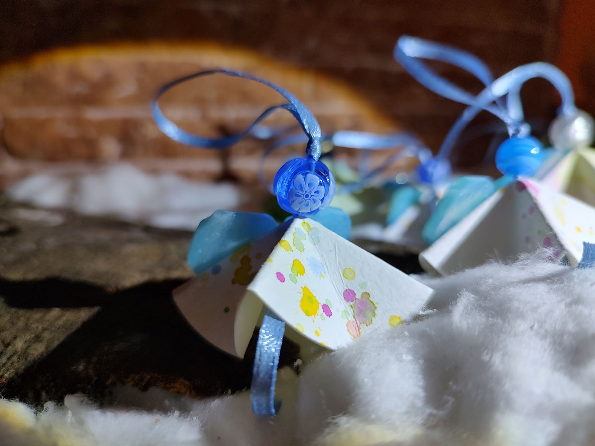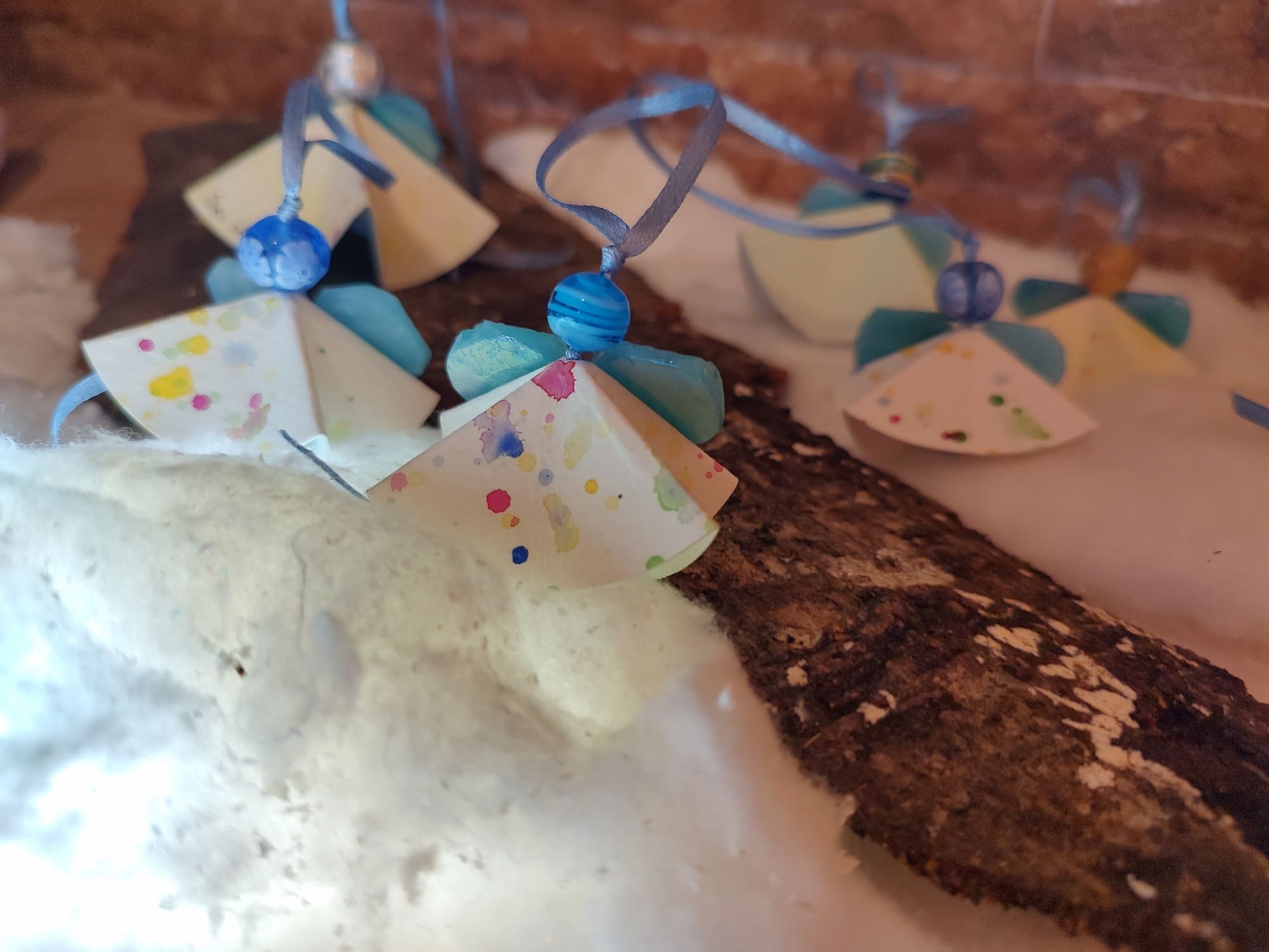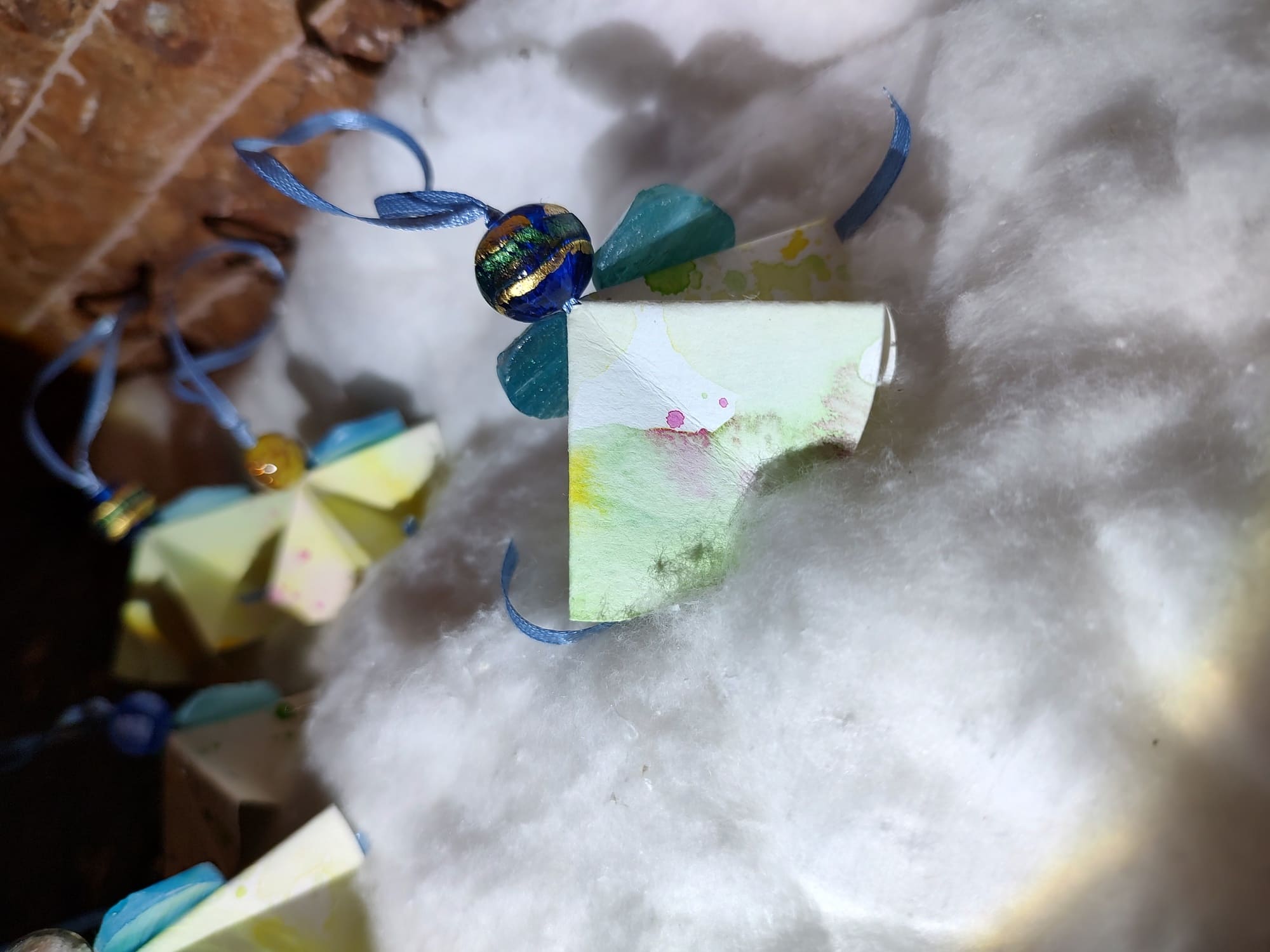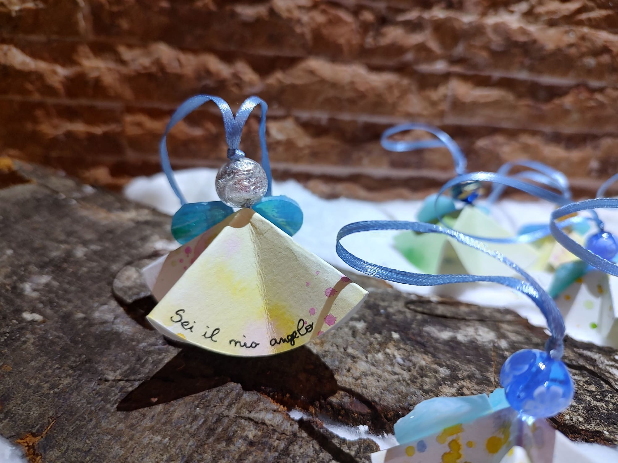 Angioletti fatti a mano in cartoncino con disegni ad acquerello e perle di murano. La loro irregolarità garantisce l’autenticità e l’unicità del prodotto.