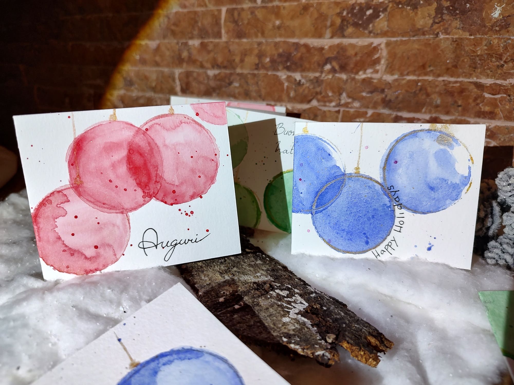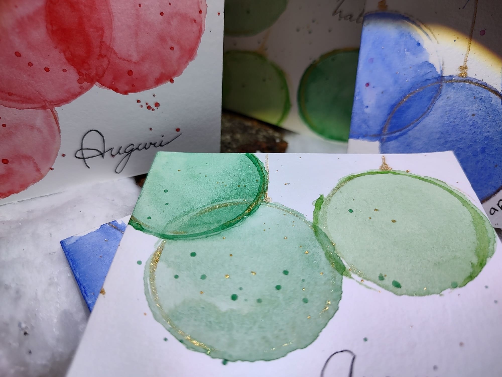 Biglietti di auguri fatti a mano in cartoncino con disegni ad acquerello. La loro irregolarità garantisce l’autenticità e l’unicità del prodotto.