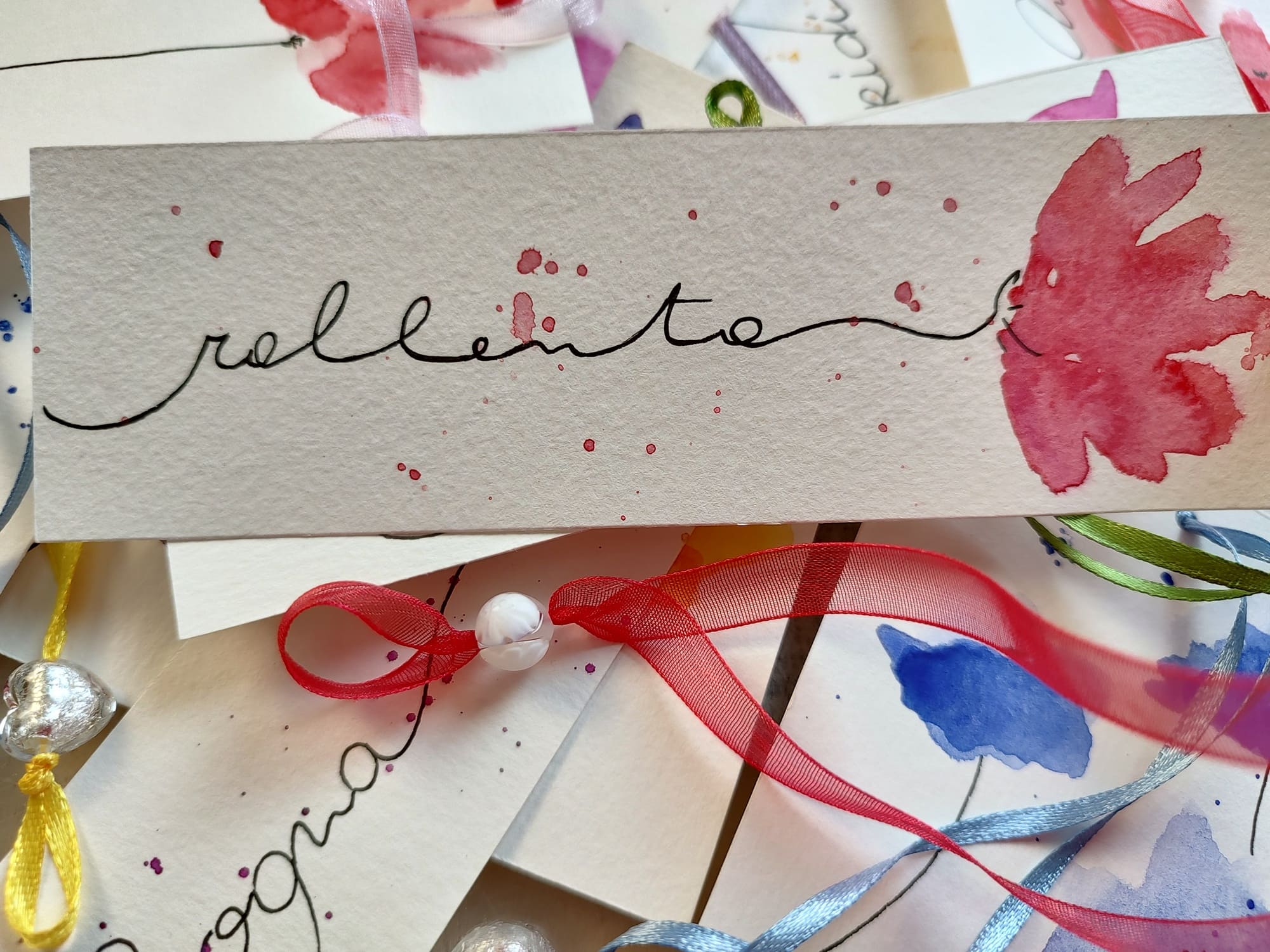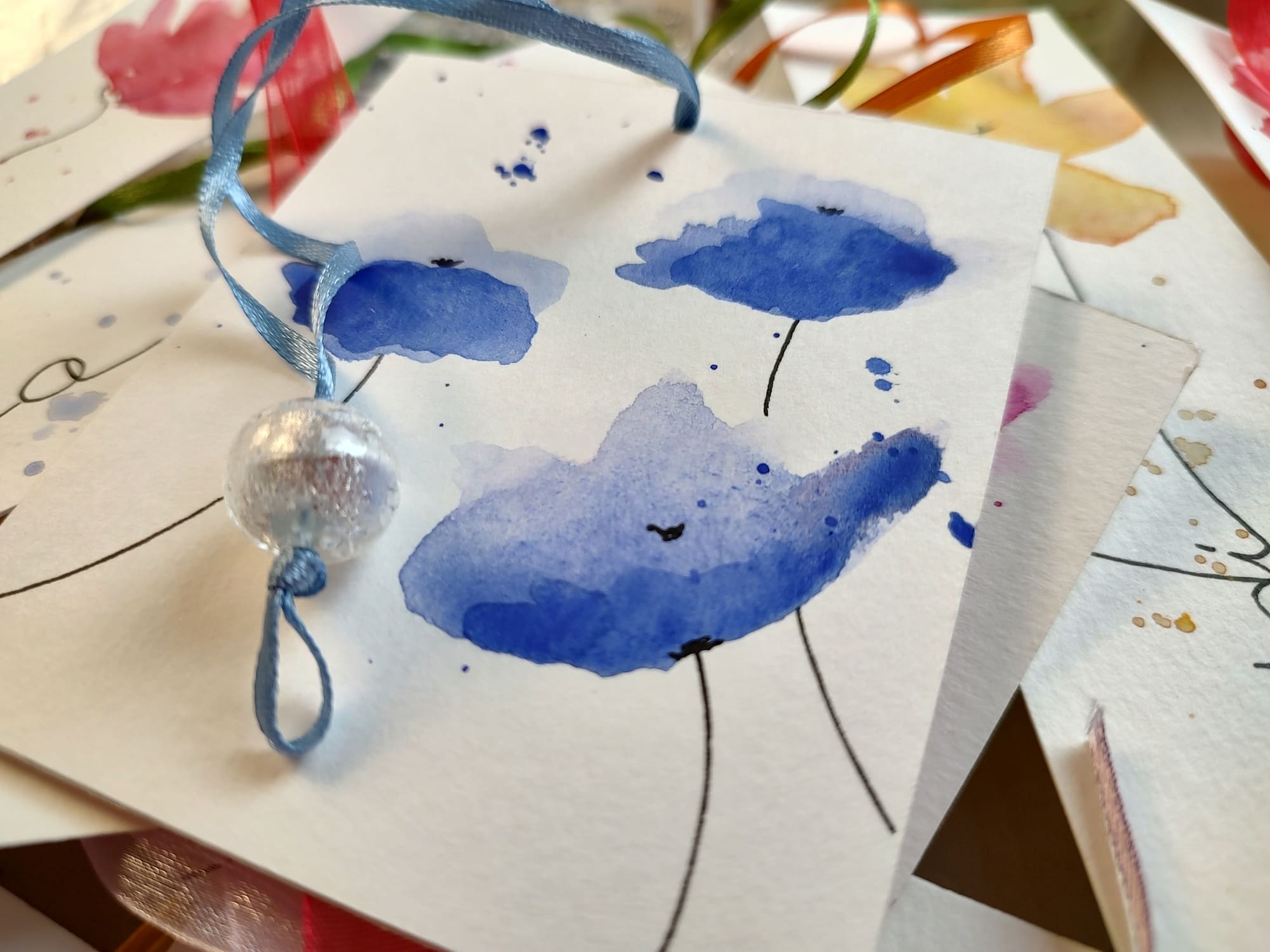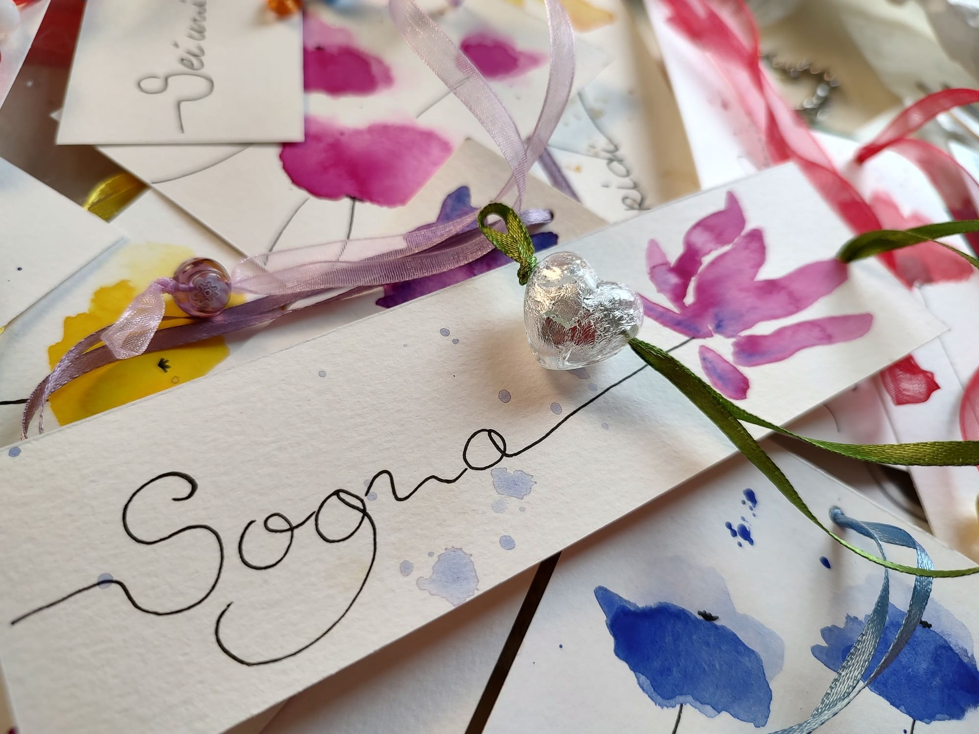 Segnalibri e segnaposto in cartoncino con disegni ad acquerello ed inserti in vetro di murano. La loro irregolarità garantisce l’autenticità e l’unicità del prodotto.