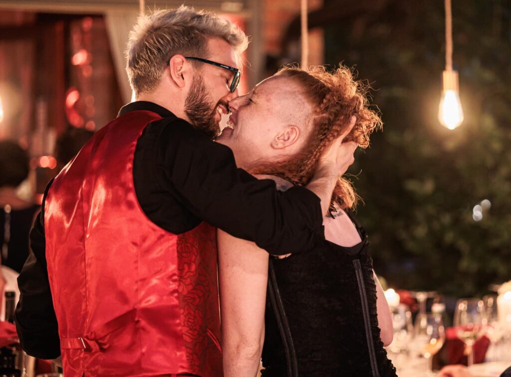 Dalle idee chiarissime, mi hanno subito proposto colori e disegni per le bomboniere da regalare a genitori e testimoni. Un cofanetto in legno decorato a mosaico con il profilo di due volti e la zampina dell’adorato cagnolino, protagonista insieme a loro nel giorno più bello. Un unico disegno declinato in due colorazioni, una con i volti bianchi e lo sfondo rosso e l’altra con i volti rosso e nero e lo sfondo bianco. Colori decisi che si addicono perfettamente a questa meravigliosa coppia.
